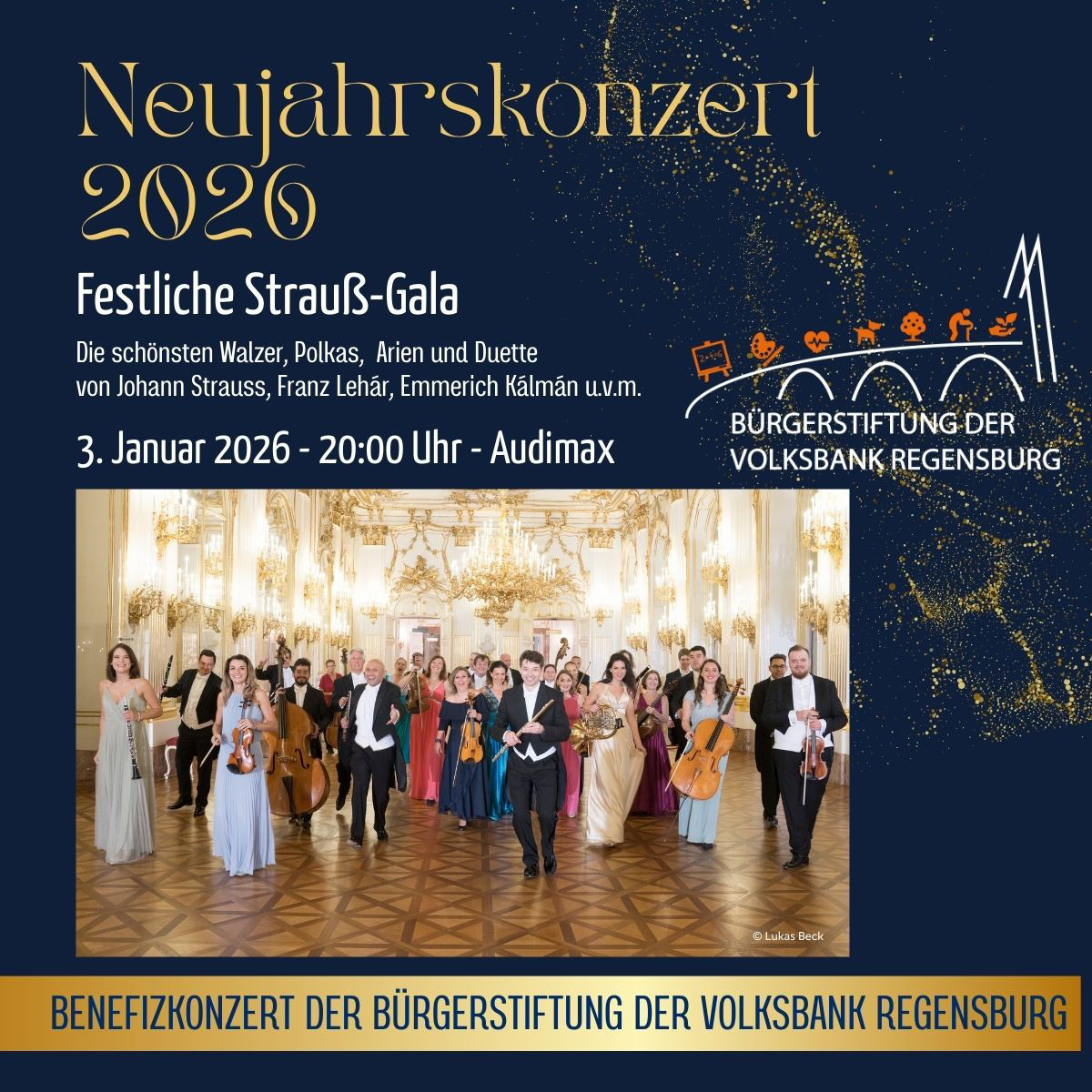 Erleben Sie am 03. Januar 2026 im Audimax Regensburg ein festliches Benefizkonzert der Bürgerstiftung der Volksbank Regensburg und starten Sie musikalisch ins neue Jahr! Das renommierte Schloss Schönbrunn Orchester, begleitet von Jenifer Lary und Marco Di Sapia und unter der Leitung von Guido Mancusi, entführt Sie anlässlich des 200. Geburtstags von Johann Strauß in die glanzvolle Welt der Wiener Walzer und des Polkas. Mit Ihrem Besuch unterstützen Sie wichtige soziale Projekte in Regensburg und Schwandorf.